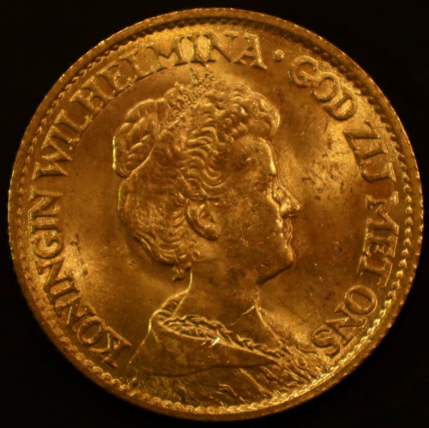 La pièce de 10 Florins néerlandaise, surnommée "Gouden Tientje" (dix en or), est une pièce d'or emblématique de l'histoire monétaire des Pays-Bas. Elle a été frappée de 1875 à 1933 sous les règnes des rois Guillaume III et des reines Wilhelmine.