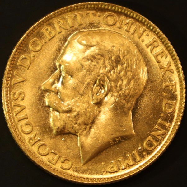 Le Souverain à l'effigie du roi George V a été frappé entre 1911 et 1932. Il est reconnaissable à l'avers par le portrait du roi tourné vers la gauche, avec l'inscription latine "GEORGIVS V D.G.BRITT: OMN: REX F.D.IND:IMP:" (George V, par la grâce de Dieu, Roi de toutes les Bretagnes, Défenseur de la Foi, Empereur des Indes).